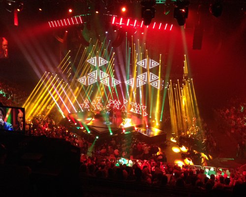 Vier 35 Meter lange Schienensysteme wurden innerhalb von zwei Tagen in den luftigen Höhen der Lanxess Arena installiert. Die Positionsgeber der Verfahrtechnik gaben ihr Signal auch an die Medienserver aus dem Hause Coolux ab.