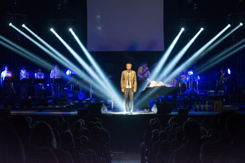 Mit von der Partie war wie gewohnt auch die satis&fy AG. Der Technikanbieter verantwortete wie schon bei den letzten Tourneen Licht, Ton, Video und Rigging der insgesamt 14 Shows. Die an sechs Towern auf der Bühne installierten 24 Robe Pointe, 18 Robin 600 LED Wash und 18 2-Lites sorgten für das rechte Licht während der Performance des Entertainers und seines Orchesters. Das Auflicht erfolgte mit sechs Robe ColorSpot 2500E AT. Visuelle Unterstützung gab es durch eine 4 x 3 Meter große Leinwand im Bühnenhintergrund, die mit einem Panasonic PT-DZ 110XE bespielt wurde. Da vor allem eine gute Sprachverständlichkeit im Vordergrund stand, fiel die Wahl des Sound-Systems nicht schwer. Ein dV-dosc Line Array des Herstellers L-Acoustics garantierte das auch die leiseste Pointe des Kabarettisten beim Publikum ankam.