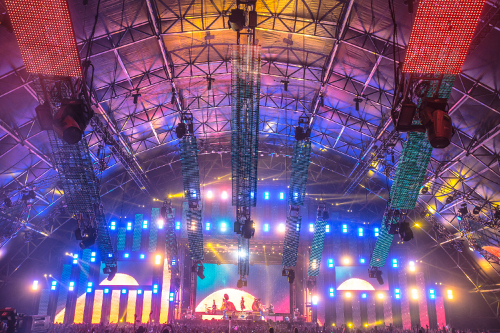 Auf sechs Bühnen gaben sich an zwei Wochenenden im April Bands wie Muse, Arcade Fire, Pet Shop Boys, Woodkid oder Outkast das Mikro in die Hand. DJs wie Fatboy Slim, Skrillex oder Duck Sauce machten die Nacht zum Tag. Gerade im Sahara Tent wurden die DJs von Eurolite blendend in Szene gesetzt.