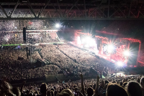 FoH Stefan Holtz: „Das PA-System von Guido war so ziemlich das Beste, worauf ich in einem Stadion bislang mischen durfte.“ Für die Main-PA kombinierte Esch 16 K1 und vier K2 pro Seite mit jeweils zwölf direkt daneben geflogenen K1-SB Subwoofern. Weitere Tieftonunterstützung lieferten die 30 KS28 in Cardioid-Konfiguration am Boden über die gesamte Bühnenbreite. Die äußeren Tribünen wurden von zehn K1 und sechs K2 als Side-PA abgedeckt, im Center arbeitete ein Cluster aus sechs Kara, während der Nahbereich durch Kiva II-Frontfills mit Direktschall versorgt wurde.
