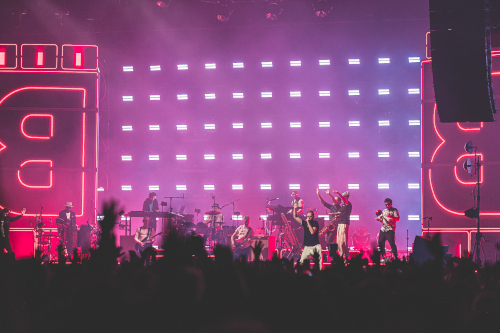 Das zentrale Element im Bühnendesign waren zwei überdimensionale Boxentürmen. Zwischen diesen Türmen wurden die Bandriser positioniert. Eine Neoninstallation an den Boxentürmen und den Bandrisern wurde zum verbindenden System. Diese sehr klar definierte Neoninstallation unterstrich intensiv die Formgebung des Sets. Um die klaren Formen des Sets musste ein Lichtsystem kreiert werden, dass sehr diffus ist um nicht mit der Neoninstallation in Konkurrenz zu treten. So bildeten das Neon und eine Matrix aus leistungsfähigen Backlights das Grundgerüst für eine brillante und eindrucksvolle Show mit jeder Menge Druck.