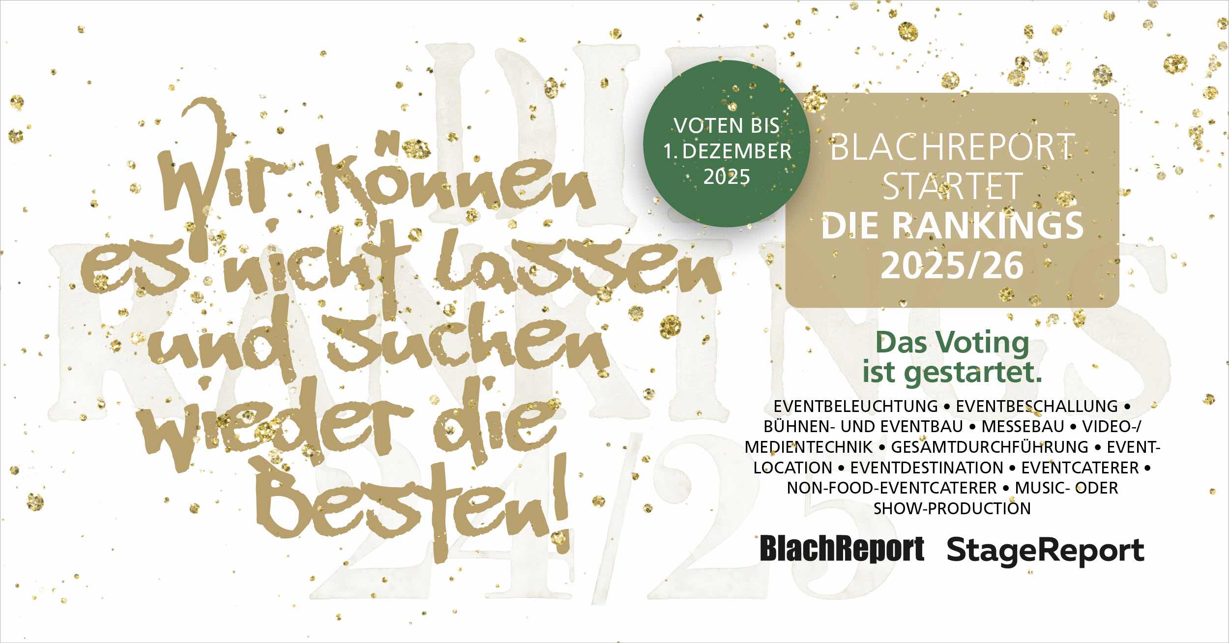 StageReport und BlachReport starten ihre jährliche Umfrage zu den besten Dienstleistern und Anbietern in der Veranstaltungswirtschaft. Ziel ist es, herauszufinden, welche Unternehmen bei ihren Auftraggebern besonders geschätzt werden – vor allem in den Bereichen technischer und infrastruktureller Eventservices.