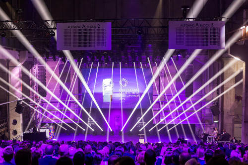 Im Erdgeschoss rollte satis&fy 1.000 Quadratmeter lila Teppich aus und stellte die 120 Quadratmeter große Pressewand auf. Außerdem wurden diverse Lampen in Position gebracht. Für die Preisverleihung im Obergeschoss des Kraftwerks installierte man eine temporäre Tribüne aus Layer-Elementen, ein 60 Tonnen Stahl-Schwergewicht, um ausreichend Platz für die 800 Gäste zu schaffen. Für das Rampenlicht wurden 48 Platinum FLX Scheinwerfer von Elation, die kürzlich erst in den Materialpool der Firma aufgenommen wurden, und 26 Impression X4 von GLP auf der Bühne zum Einsatz gebracht. Den Dinner-Bereich im Obergeschoss leuchtete satis&fy mit Expolite Akku Scheinwerfern, Castor 2000 Stufenlinsen, 6er bar Par 64 Scheinwerfern und Zoom Profiler atmosphärisch aus.