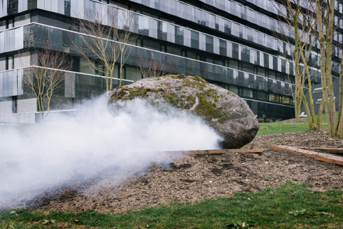 Die Idee für „Rauchstein“ hatten Schumacher-Clavadetscher bereits vor einigen Jahren im kleineren Format in Dänemark umgesetzt, bevor die Stadt Zürich das Konzept für ihren prestigeträchtigen Klinikbau des städtischen Triemli Spitals erwarb. Die Installationfand ihren Platz vor dem Neuen Bettenhaus des Triemli, wo nun täglich intensiver Nebel unter dem Stein hervordringt.