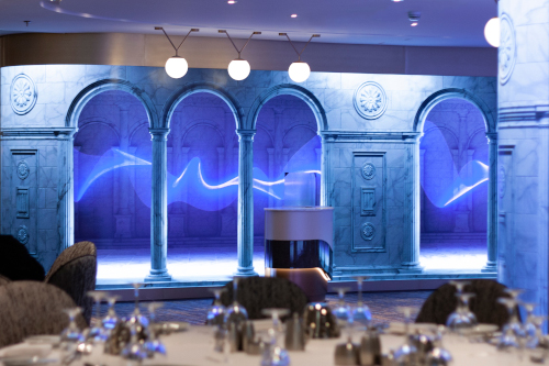 Auf zwei Decks des Main Dining Rooms sind zwei weitere curved LED Walls in den Lounge-Ecken installiert. Die identischen Screens haben eine Länge von acht Metern, eine Höhe von einem Meter und eine Auflösung von 4.096 x 512 Pixeln. Die insgesamt 155 Quadratmeter LED-Flächen in den Eingangsbereichen und der beiden Walls in den Lounge-Ecken sind speziell beschichtet und abwaschbar.