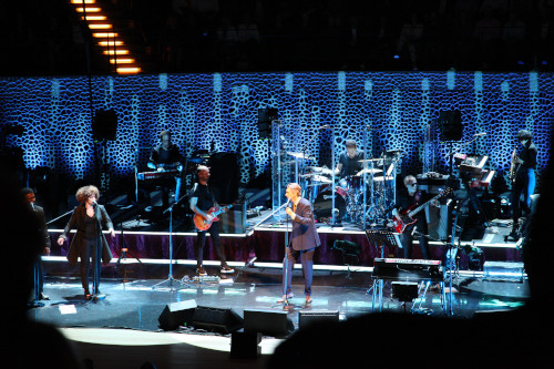 Ein über der Bühne platzierter Traversenkreis nahm die Beschallung für die oberen Ränge auf. Diese Bestand aus sechs 10er-Arrays Alcons LR18 / 90° für je links / rechts Main-, Side- und Rearhang, einem 2er-Cluster Alcons RR12 als Rearfill, um den Nahbereich aufzufüllen, und einem 8er-Cluster Alcons LR14B.
