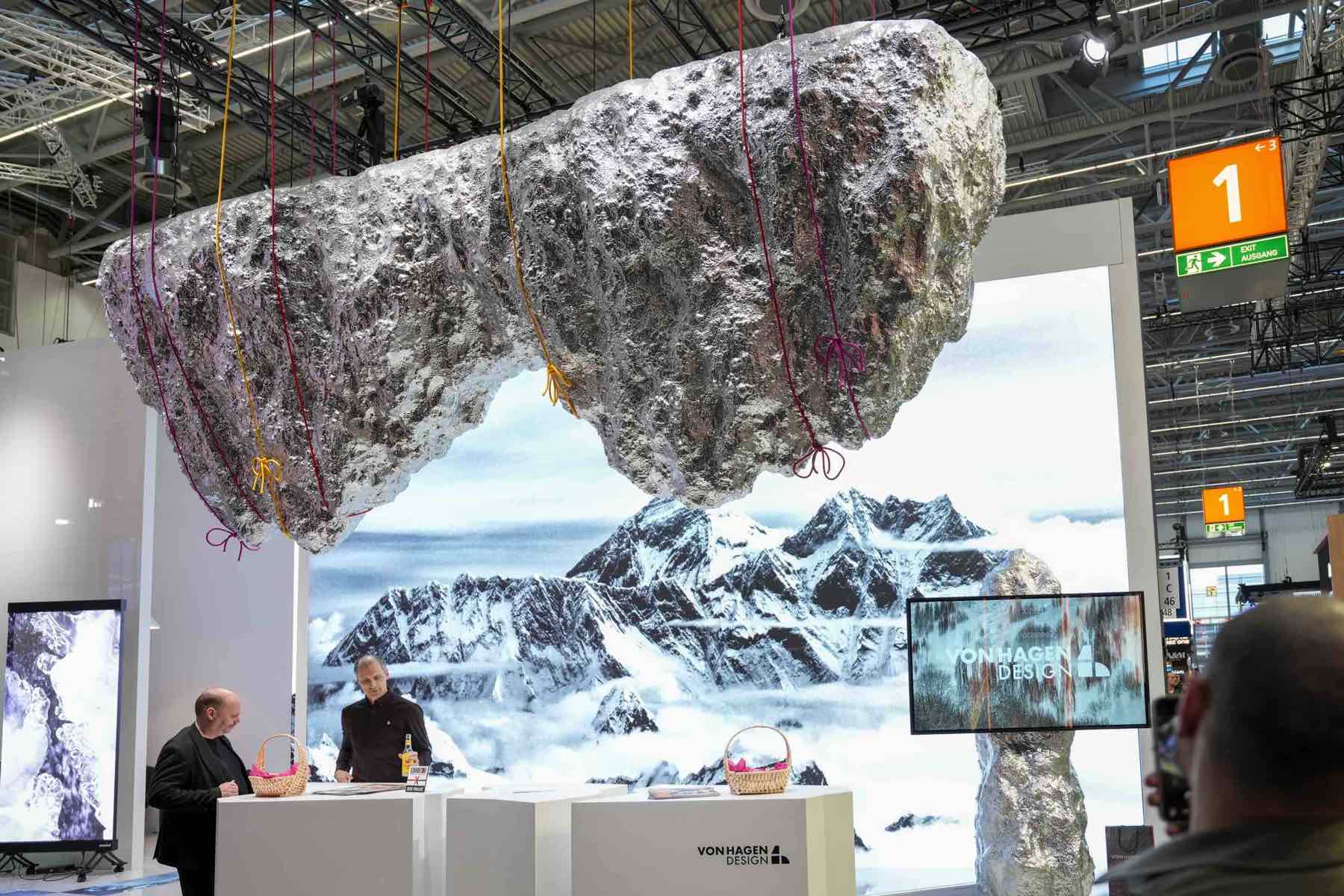 von Hagen Design präsentierte sich bei der EuroShop 2026 in Düsseldorf mit einem eigenen Messeauftritt, der Architektur, Kunst und Medientechnik miteinander verband. Auf rund 70 Quadratmetern entstand ein offener Designraum, dessen zentrales Element ein überdimensionaler, umgedrehter Stein war, der an Seilen unter der Hallendecke schwebte. Zwei kleinere Steine dienten als Träger für interaktive Monitore. Die linke Seite des Standes wurde durch eine fünf Meter hohe transparente LED-Wand geprägt.